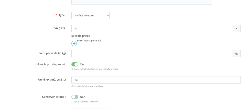 Ce champs va vous permettre de vendre des produits selon un prix par dimensions (mètre, centimètre…) ou selon la surface (mètre carré, centimètre carré…)