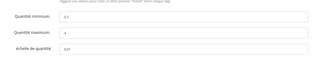 Pour chacune de ces valeurs vous pourrez définir : le maximum, le minimum, l’échèle de quantité (de 1 en 1, de 10 en 10, de 0.1 en 0.1 …).